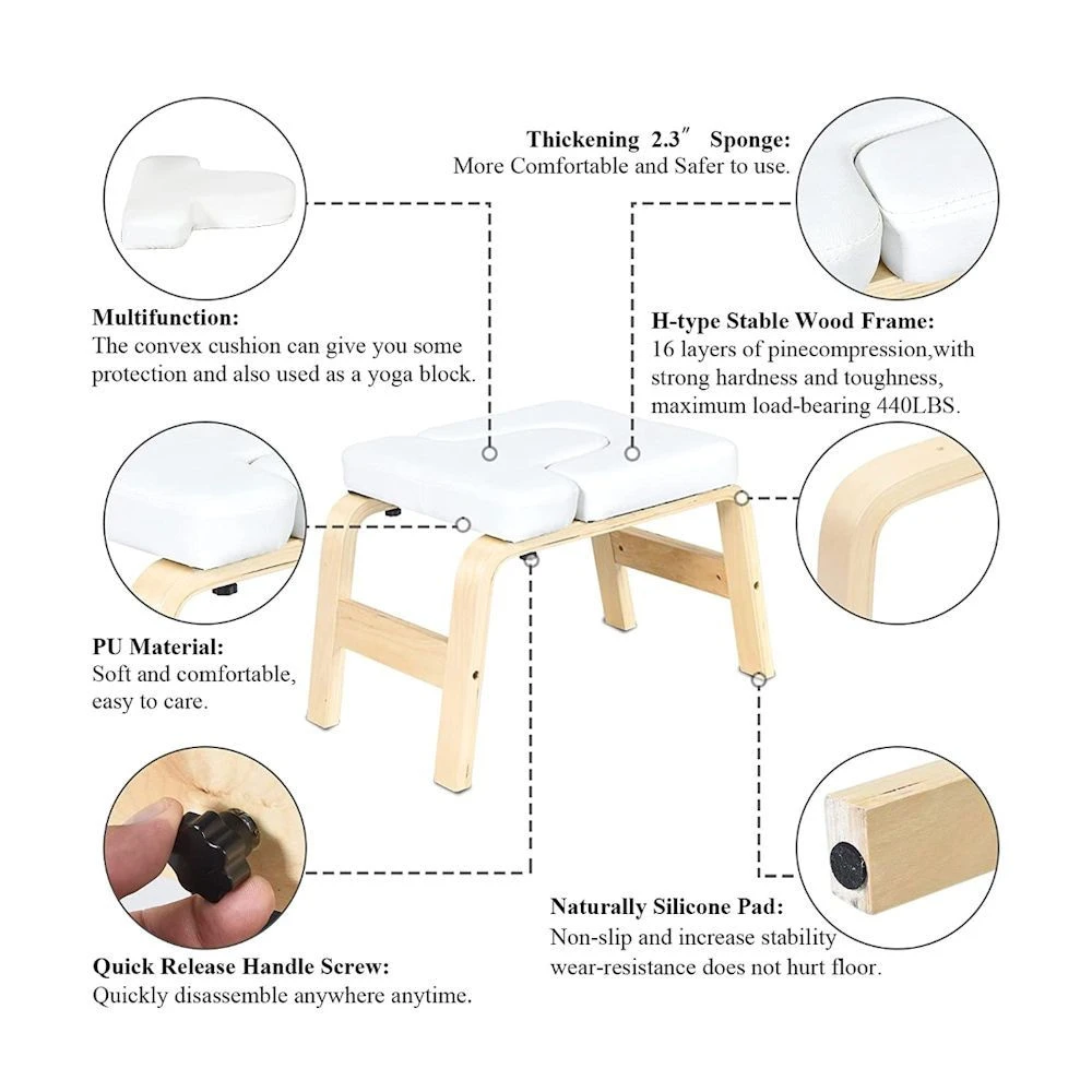 De constructie van het gebogen bamboehout en de zachte witte kussens bieden deze yogastoel een uitstekende basis voor je nek en schouders, wat resulteert in optimaal comfort en veiligheid tijdens de inversie.