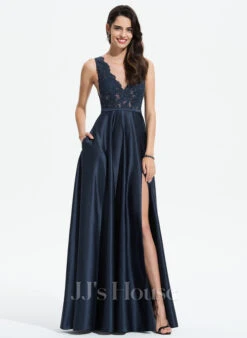 A-lijn-jurk V-hals Vloer Lengte Satijn Satijn Galajurk Met Kant Split Voorzijde Zakken Pailletten