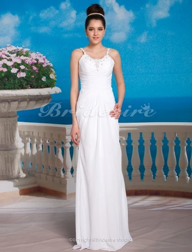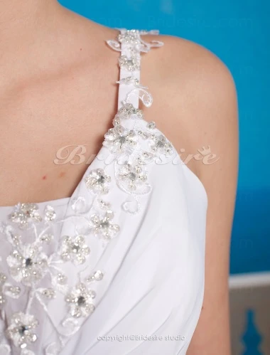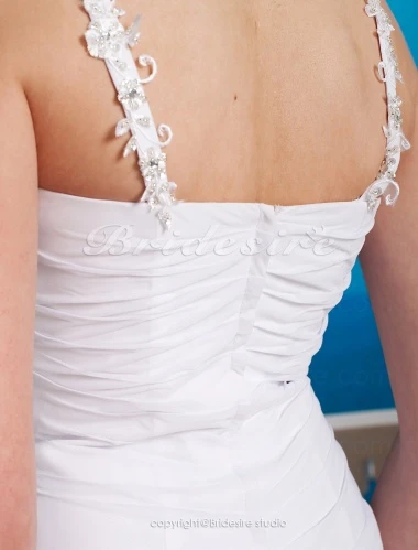 Een speciale dag vereist een speciale jurk en deze trouwjurk van chiffon is perfect. Met aantrekkelijke appliqués en fijne kralen, is deze jurk flitsend en elegant. Deze jurk biedt een flatterende pasvorm met een klassieke stijl en de toevoegingen van de moderne seksualiteit van een halslijn met spaghettibandjes en een nauwsluitende pasvorm. Door deze unieke, maar prachtige combinatie is deze jurk een perfecte keuze voor elke bruid.