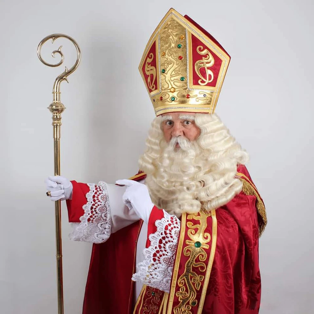 Hét Sinterklaaskostuum van de Belgische Ketnetserie Dag Sinterklaas!!! Dit kostuum is volledig handgemaakt en zeer luxueus afgewerkt. Slechts verkrijgbaar in heel beperkte oplage. Deze complete set bestaat uit: geborduurde mijter, mantel en stola, een witte jurk en rode broekrok. De bijhorende accessoires zijn afzonderlijk verkrijgbaar.