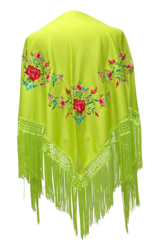 Spaanse manton/omslagdoek, groen met diverse kleuren bloemen. Prachtig als omslagdoek om de schouders of om de heupen.