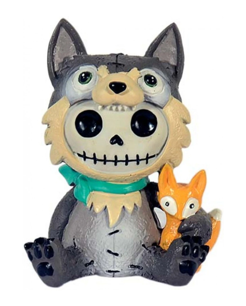 Frecher Wolf als Furrybones Skelettfigur mit kleinem Fuchs auf dem Arm